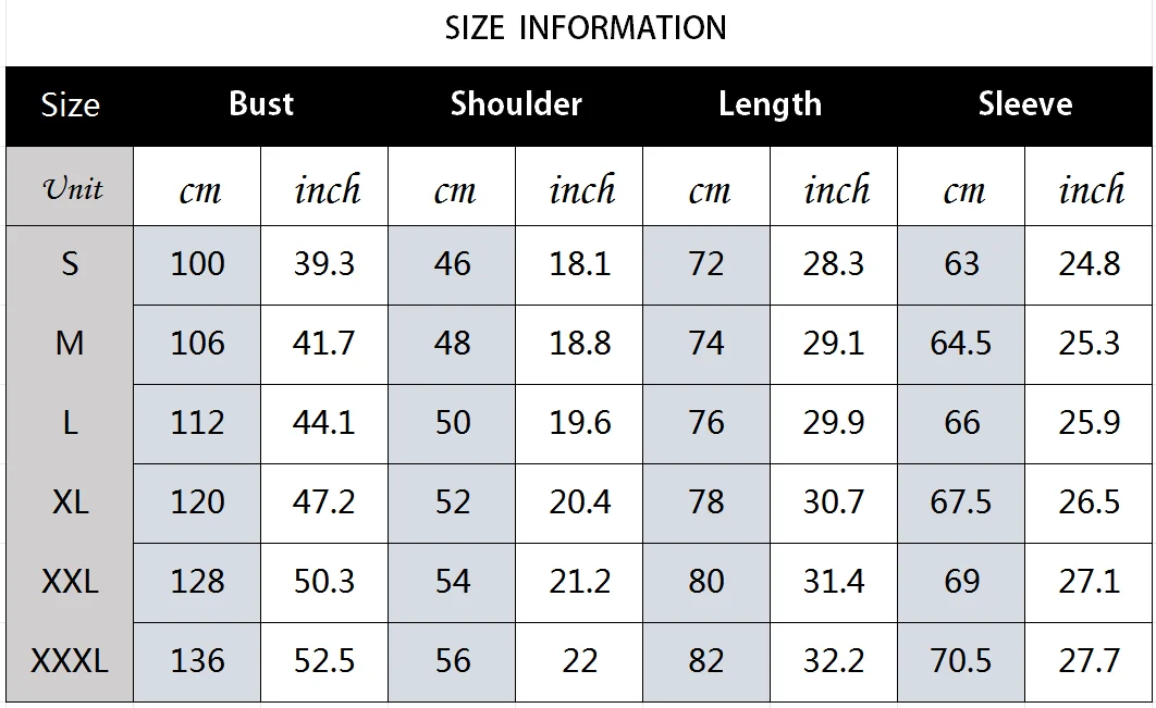 size_info: {“sizeInfoList”:[{“length”:{“cm”:”100″,”inch”:”39.37″},”size”:”S”,”vid”:-1},{“length”:{“cm”:”106″,”inch”:”41.73″},”size”:”M”,”vid”:-2},{“length”:{“cm”:”112″,”inch”:”44.09″},”size”:”L”,”vid”:-3},{“length”:{“cm”:”120″,”inch”:”47.24″},”size”:”XL”,”vid”:-4},{“length”:{“cm”:”128″,”inch”:”50.39″},”size”:”XXL”,”vid”:-5},{“length”:{“cm”:”136″,”inch”:”53.54″},”size”:”XXXL”,”vid”:-6}]}